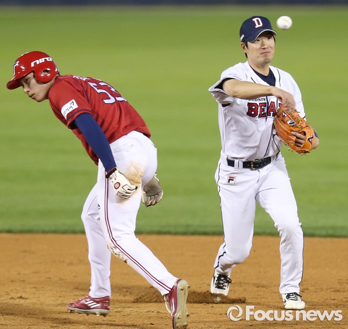(서울=포커스뉴스) 19일 서울 잠실구장에서 열린 2016프로야구 KIA-두산 경기 4회초 1사 1루에서 KIA 오준혁의 2루 땅볼떄 두산 유격수 김재호가 1루주자 김호령을 포스아웃시키고 1루로 송구해 더블플레이를 성공하고 있다.