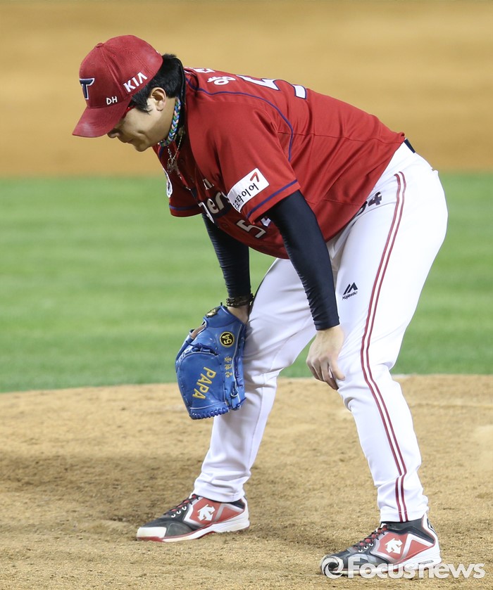 (서울=포커스뉴스) 19일 서울 잠실구장에서 열린 2016프로야구 KIA-두산 경기 5회말 2사후 두산 에반스에게 2점 홈런을 맞은 KIA 양현종이 고개를 떨구고 있다.