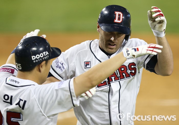 (서울=포커스뉴스) 19일 서울 잠실구장에서 열린 2016프로야구 KIA-두산 경기 5회말 2사 1루에서 두산 에반스가 좌월 2점 홈런을 치고 선행주자 양의지의 환영을 받으며 홈인하고 있다.
