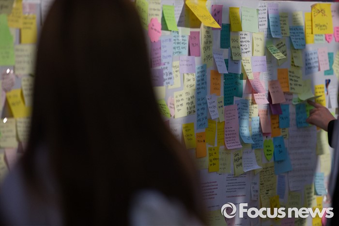 (서울=포커스뉴스) 19일 오후 서울 서초구 강남역 10번출구에서 시민들이 '강남 묻지마 살인' 피해자를 추모하고 있다.