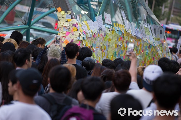 (서울=포커스뉴스) 19일 오후 서울 서초구 강남역 10번출구에서 시민이 '강남 묻지마 살인' 피해자를 추모하고 있다.