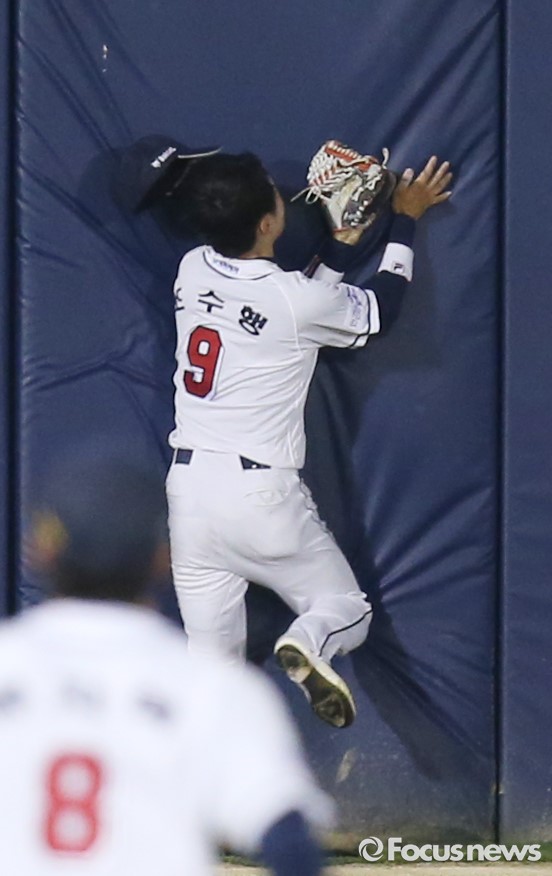 (서울=포커스뉴스) 19일 서울 잠실구장에서 열린 2016프로야구 KIA-두산 경기 7회초 1사 1루에서 두산 좌익수 조수행이 KIA 필의 플라이볼 타구를 잡은후 펜스에 부딪치고 있다.