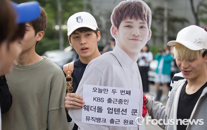(서울=포커스뉴스) 20일 오전 서울 영등포구 KBS에서 아이돌그룹 업텐션의 멤버들이 생방송 뮤직뱅크 리허설에 참여하기 위해 이동하던 중 인터뷰를 하고 있다.