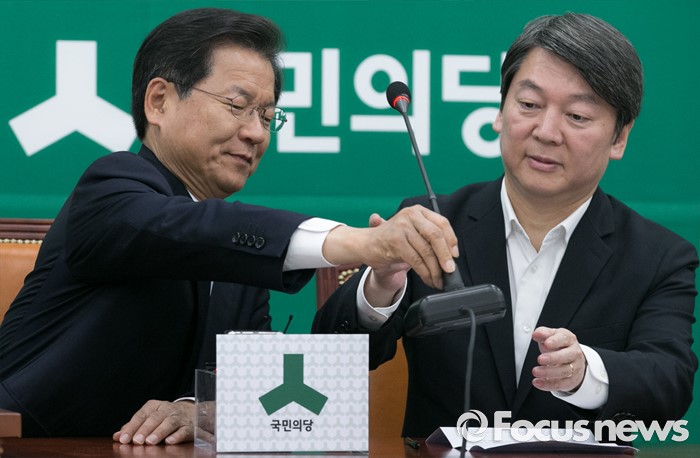 (서울=포커스뉴스) 안철수(오른쪽) 국민의당 상임공동대표, 천정배 공동대표가 20일 오전 서울 여의도 국회에서 열린 최고위원회의에 참석해 마이크를 옮기고 있다.