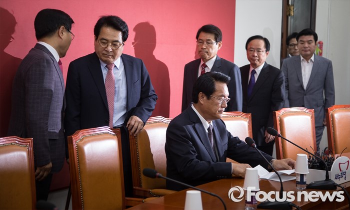 (서울=포커스뉴스) 정진석(앞 앉은 사람) 새누리당 원내대표와 중진의원들이 20일 오전 서울 여의도 국회에서 열린 원내지도부-중진의원 연석회의에 참석하고 있다. 뒷줄 왼쪽부터 홍문종, 심재철, 이군현, 이주영, 정병국, 원유철 의원.