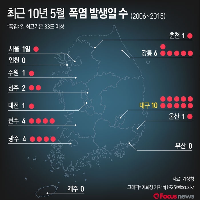 (서울=포커스뉴스) 19일 기상청이 발표한 자료에 따르면 최근 10년(2006~2015년) 5월 국내 주요도시 중 폭염 발생일 수가 가장 높은 도시는 대구로 나타났다.