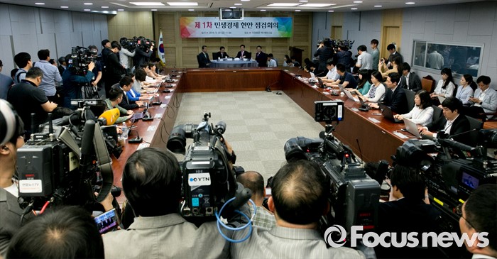 (서울=포커스뉴스) 20일 오전 서울 여의도 국회 의원회관에서 열린 1차 민생경제현안점검회의에 참석한 3당 정책위의장과 유일호 경제부총리 겸 기획재정부 장관이 논의를 하고 있다. 왼쪽부터 김성식 국민의당 정책위의장, 변재일 더불어민주당 정책위의장, 김광림 새누리당 정책위의장, 유 부총리.