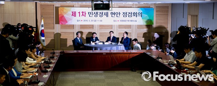 (서울=포커스뉴스) 20일 오전 서울 여의도 국회 의원회관에서 열린 1차 민생경제현안점검회의에 참석한 3당 정책위의장과 유일호 경제부총리 겸 기획재정부 장관이 논의를 하고 있다. 왼쪽부터 김성식 국민의당 정책위의장, 변재일 더불어민주당 정책위의장, 김광림 새누리당 정책위의장, 유 부총리.