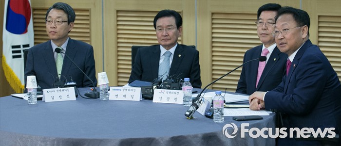 (서울=포커스뉴스) 20일 오전 서울 여의도 국회 의원회관에서 열린 1차 민생경제현안점검회의에 참석한 유일호 경제부총리 겸 기획재정부 장관이 모두발언을 하고 있다. 왼쪽부터 김성식 국민의당 정책위의장, 변재일 더불어민주당 정책위의장, 김광림 새누리당 정책위의장, 유 부총리.