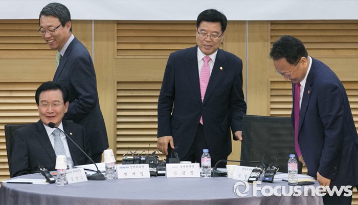 (서울=포커스뉴스) 20일 오전 서울 여의도 국회 의원회관에서 열린 1차 민생경제현안점검회의에 참석한 3당 정책위의장과 유일호 경제부총리 겸 기획재정부 장관이 인사한 뒤 자리로 향하고 있다. 왼쪽부터 변재일 더불어민주당 정책위의장, 김성식 국민의당 정책위의장, 김광림 새누리당 정책위의장, 유 부총리.