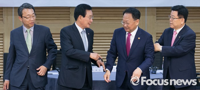 (서울=포커스뉴스) 20일 오전 서울 여의도 국회 의원회관에서 열린 1차 민생경제현안점검회의에 참석한 3당 정책위의장과 유일호 경제부총리 겸 기획재정부 장관이 취재진을 향해 포즈를 취하고 있다. 왼쪽부터 김성식 국민의당 정책위의장, 변재일 더불어민주당 정책위의장, 유 부총리, 김광림 새누리당 정책위의장.