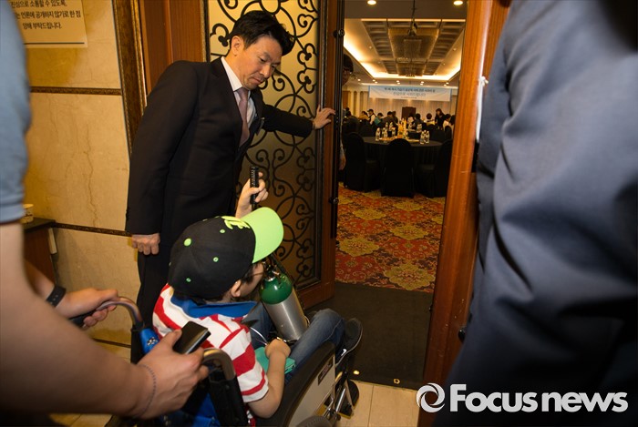 (대전=포커스뉴스) 아타 사프달 옥시레킷벤키저 대표와 임원진이 20일 오후 대전 유성구 아드리아호텔에서 옥시의 가습기 살균제 제품 피해자와 면담을 마련한 가운데 피해 어린이가 입장하고 있다.