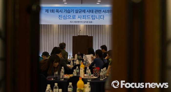 (대전=포커스뉴스) 아타 사프달 옥시레킷벤키저 대표와 임원진이 20일 오후 대전 유성구 아드리아호텔에서 옥시의 가습기 살균제 제품 피해자와 면담을 마련한 가운데 피해자들이 모여 있다.