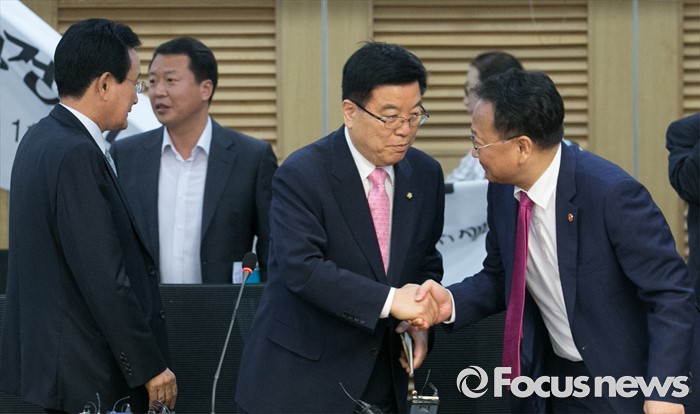 (서울=포커스뉴스) 20일 오후 서울 여의도 국회 의원회관에서 1차 민생경제 현안 점검회의를 마친 3당 정책위의장과 유일호 경제부총리 겸 기획재정부 장관이 취재진을 대상으로 결과 브리핑 후 악수하고 있다. 왼쪽부터 변재일 더불어민주당 정책위의장, 김광림 새누리당 정책위의장, 유 부총리.