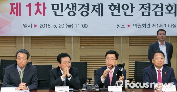 (서울=포커스뉴스) 20일 오후 서울 여의도 국회 의원회관에서 1차 민생경제 현안 점검회의를 마친 3당 정책위의장과 유일호 경제부총리 겸 기획재정부 장관이 취재진을 대상으로 결과 브리핑을 하고 있다. 왼쪽부터 김성식 국민의당 정책위의장, 변재일 더불어민주당 정책위의장, 김광림 새누리당 정책위의장, 유 부총리.