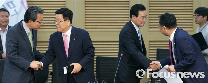 (서울=포커스뉴스) 20일 오후 서울 여의도 국회 의원회관에서 1차 민생경제 현안 점검회의를 마친 3당 정책위의장과 유일호 경제부총리 겸 기획재정부 장관이 취재진을 대상으로 결과 브리핑 후 악수하고 있다. 왼쪽부터 김성식 국민의당 정책위의장, 김광림 새누리당 정책위의장, 변재일 더불어민주당 정책위의장, 유 부총리.