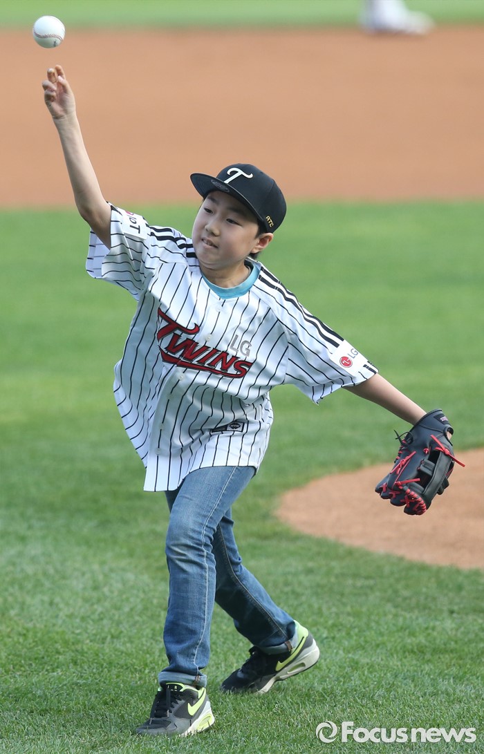 (서울=포커스뉴스) 20일 서울 잠실구장에서 열린 2016 프로야구 넥센-LG 경기에서 다문화가정 어린이 박승환군이 시구하고 있다.