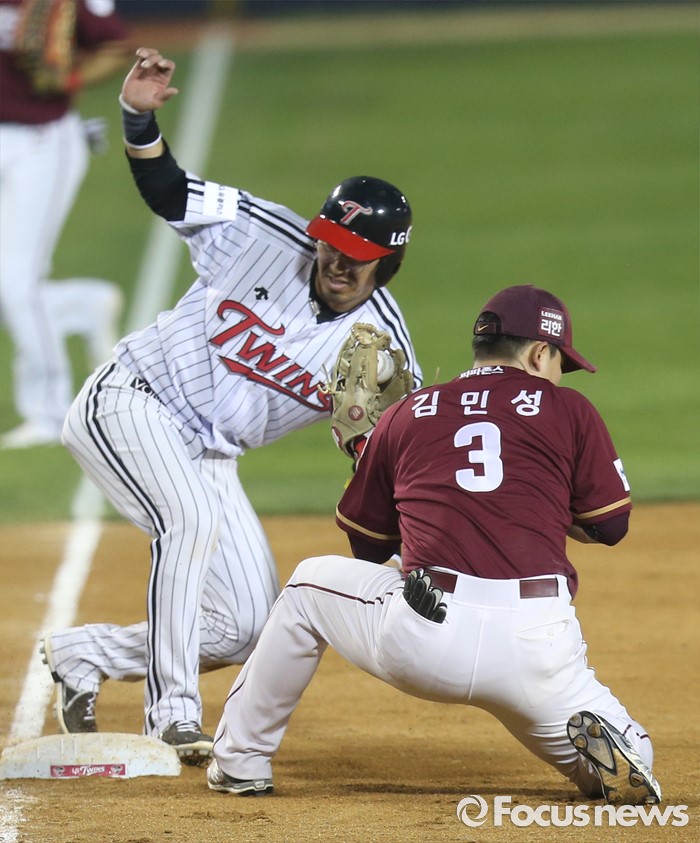 (서울=포커스뉴스) 20일 서울 잠실구장에서 열린 2016 프로야구 넥센-LG 경기 8회말 1사 3루에서 LG 정성훈이 우익수를 넘기는 타구를 날리고 3루에서 세이프되고 있다.