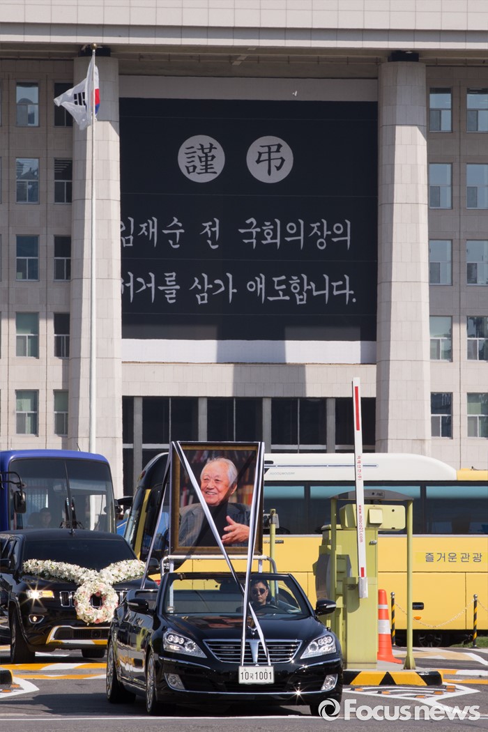(서울=포커스뉴스) 21일 오전 서울 여의도 국회에서 엄수된 故 김재순 전 국회의장 국회장 영결식을 마친 뒤 운구행렬이 국회를 떠나고 있다.