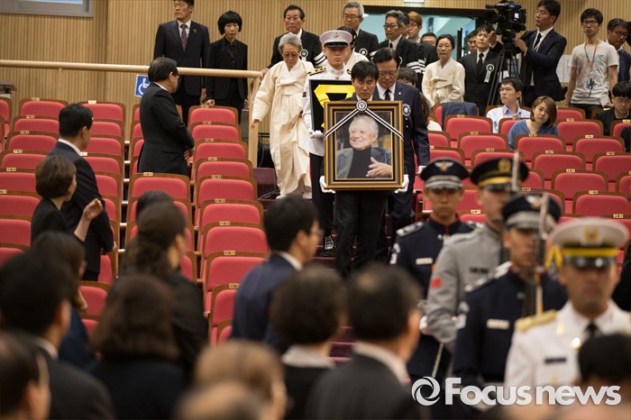 (서울=포커스뉴스) 21일 오전 서울 여의도 국회에서 엄수된 故 김재순 전 국회의장 국회장 영결식에 고인의 영정사진과 유가족들이 입장하고 있다.