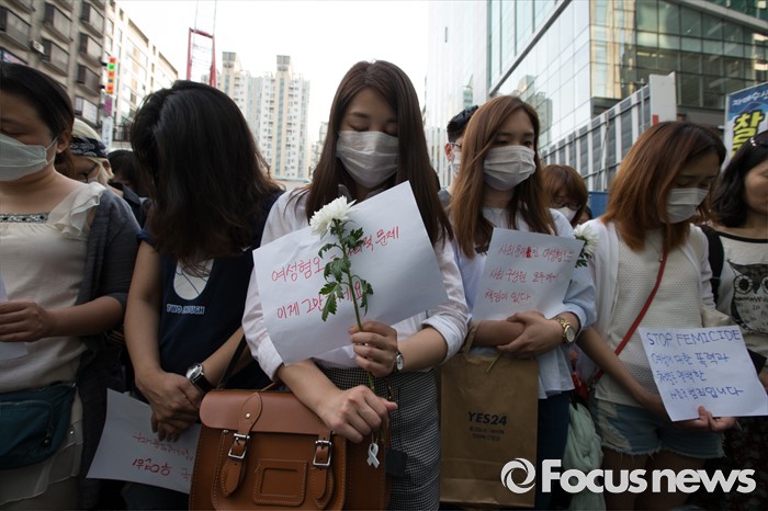 (서울=포커스뉴스) 시민들이 21일 오후 서울 서초구 강남역 10번 출구 인근에서 '강남역 여성혐오 살인사건 추모 집회'에 참석해 행진하며 피해자 사건현장 앞에서 묵념하고 있다.