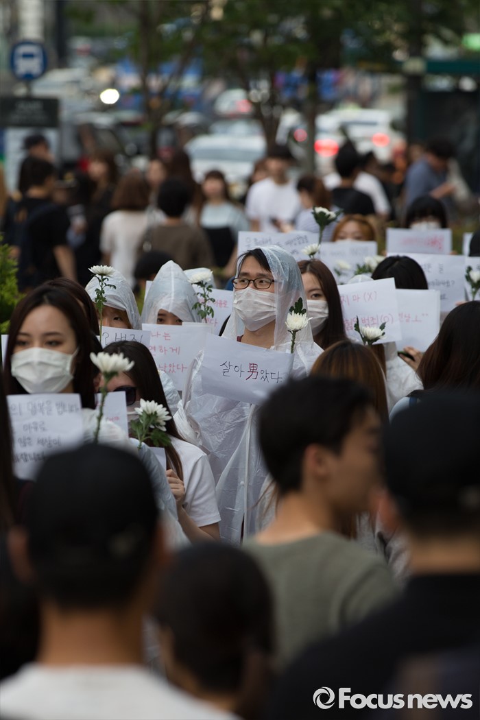 (서울=포커스뉴스) 21일 오후 서울 서초구 강남역 10번 출구 인근에서 시민들이 '강남역 여성혐오 살인사건 추모 집회'에 참석해 행진하고 있다.