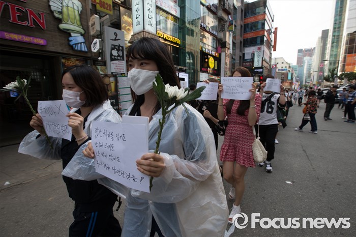 (서울=포커스뉴스) 21일 오후 서울 서초구 강남역 10번 출구 인근에서 시민들이 '강남역 여성혐오 살인사건 추모 집회'에 참석해 행진하고 있다.