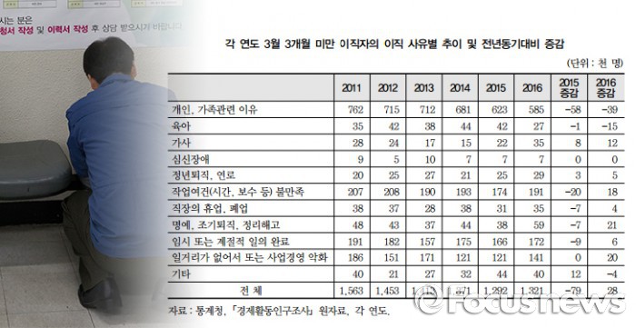 사유를 보면 개인·가족 이유(3만9000명), 육아(1만5000명)의 이유는 감소한 반면 불만족(1만8000명)에서 소폭 증가했다.