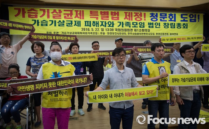 (서울=포커스뉴스) 가습기살균제 피해자와 가족모임(가피모)이 22일 오후 서울 영등포구 국회의원회관에서 열린 '2016 가습기살균제피해자 및 가족모임 법인창립총회'에서 특별법 재정과 책임자 처벌을 촉구하고 있다.