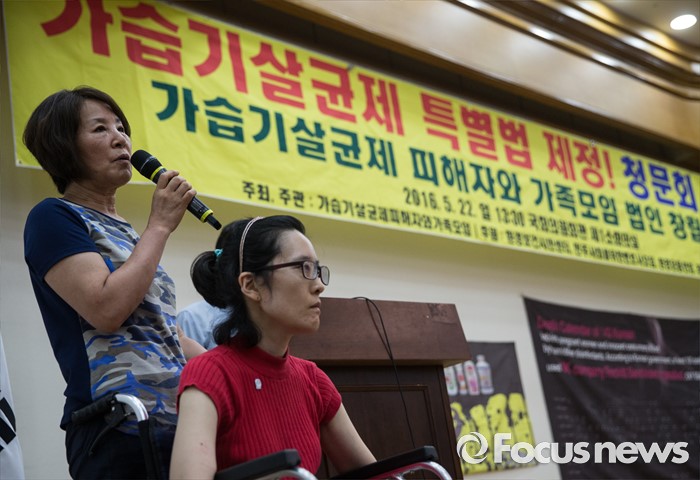 (서울=포커스뉴스) 삼성전자 LCD 공장에서 일하다 뇌종양을 앓게 된 한혜경씨와 그의 어머니가 22일 오후 서울 영등포구 국회의원회관에서 열린 '2016 가습기살균제피해자 및 가족모임 법인창립총회'에 참석해 발언하고 있다.
