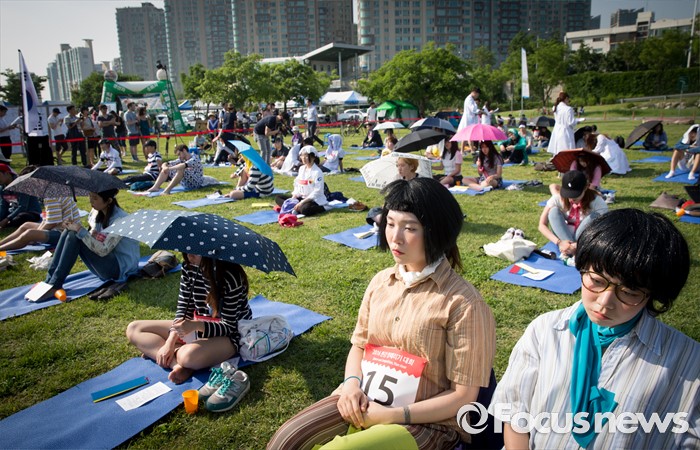 (서울=포커스뉴스) 22일 오후 서울 용산구 이촌 한강공원에서 열린 '한강 멍때리기 대회'에서 참가자들이 멍하게 앉아 있다.