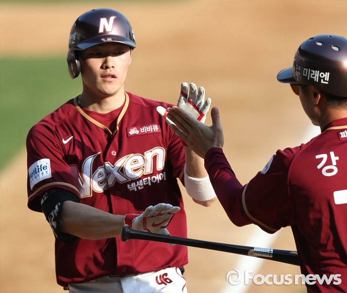 (서울=포커스뉴스) 22일 서울 잠실구장에서 열린 2016 프로야구 넥센-LG 경기 3회초 1사후 넥센 임병욱이 우월 솔로 홈런을 치고 강병식 코치의 환영을 받으며 홈인하고 있다.