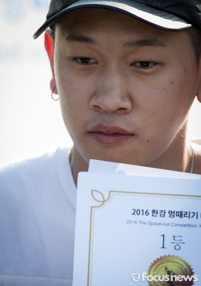 (서울=포커스뉴스) 22일 오후 서울 용산구 이촌 한강공원에서 열린 '한강 멍때리기 대회'에 참가해 1등을 수상한 래퍼 크러쉬가 멍한 표정으로 상장과 트로피를 들고 있다.