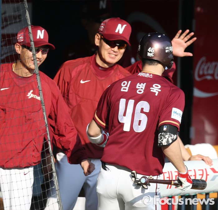 (서울=포커스뉴스) 22일 서울 잠실구장에서 열린 2016 프로야구 넥센-LG 경기 3회초 1사후 넥센 임병욱이 우월 솔로 홈런을 치고 덕아웃에서 염경엽 감독의 환영을 받고 있다.