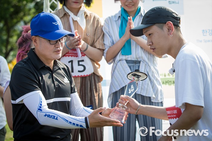 (서울=포커스뉴스) 22일 오후 서울 용산구 이촌 한강공원에서 열린 '한강 멍때리기 대회'에 참가한 래퍼 크러쉬가 1등을 수상하고 있다.