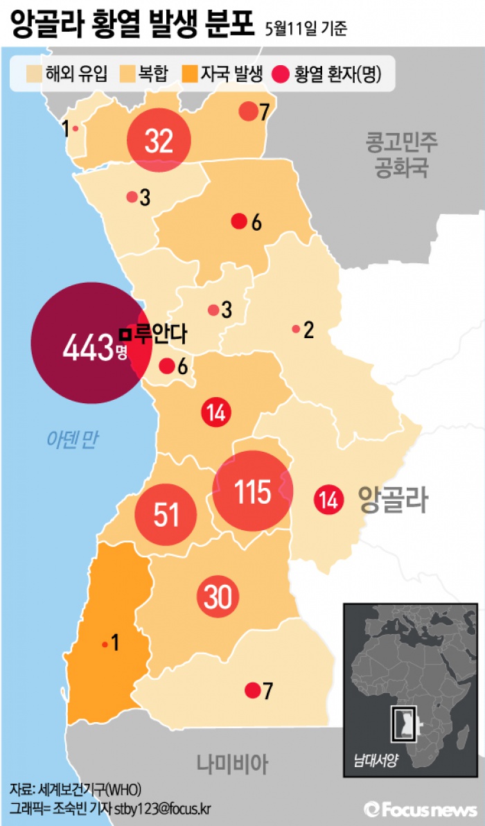 (서울=포커스뉴스) 22일 세계보건기구(WHO)에 따르면 앙골라에서는 올해 5월11일 기준으로 수도 루안다 외 14개주에서 확진환자 696명(사망 293)이 발생했다.
