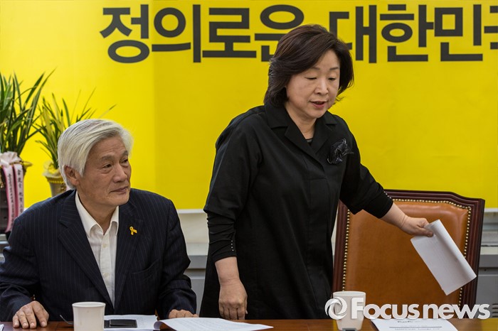(서울=포커스뉴스) 심상정(오른쪽) 정의당 상임대표가 23일 오전 서울 여의도 국회에서 열린 상무위원회에 참석하기 위해 회의실로 들어서고 있다.