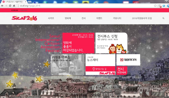 한편 1995년에 시작되어 올해 20회를 맞이한 시카프2016은 세계 5대 애니메이션 영화제이자 예술, 기술, 교육, 산업 등이 함께 모여 대중과 함께 향유하는 허브형 축제다. 올해는 7월6일부터 10일까지 5일간 동대문디자인플라자(DDP)와 CGV 명동역 지점에서 열린다.제20회 서울국제만화애니메이션페스티벌 공식 홈페이지 화면.<사진제공=시카프 조직위원회>