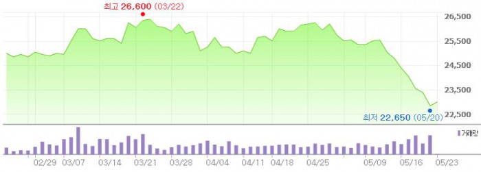 그는 "침체된 패션업황을 반영해 올해와 내년 연간 수익예상을 하향 조정한다"며 목표주가를 기존 3만6000원에서 2만8000원으로 하향 조정했다.최근 3개월간 LF 주가 추이 <그래픽출처=네이버>