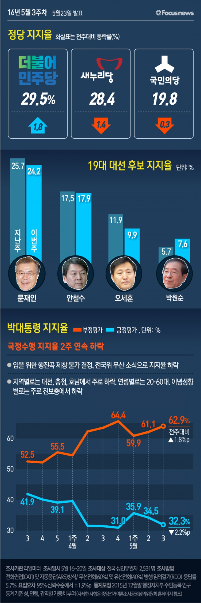 2016년 5월 3주차 주간집계는 16일부터 20일까지 5일간 전국 19세 이상 유권자 2,531명을 대상으로 전화면접(CATI) 및 자동응답(ARS) 방식으로 무선전화(60%)와 유선전화(40%) 병행 임의걸기(RDD) 방법으로 조사했고, 응답률은 전화면접 17.2%, ARS 5.0%로 전체 5.7%(총 통화 44,606명 중 2,531명 응답 완료)였다. 통계보정은 2015년 12월말 행정자치부 주민등록 인구통계 기준 성, 연령, 권역별 가중치 부여 방식으로 이루어졌고, 표집오차는 95% 신뢰수준에서 ±1.9%p이다. 일간집계는 ‘2일 이동 시계열(two-day rolling time-series)’ 방식으로 16일 1,020명, 17일 1,015명, 18일 1,008명, 19일 1,010명, 20일 1,013을 대상으로 실시했고, 응답률은 16일 5.2%, 17일 5.0%, 18일 5.2%, 19일 5.9%, 20일 5.9%, 표집오차는 5일간 모두 95% 신뢰수준에서 ±3.1%p이다. 일간집계의 통계보정 방식은 주간집계와 동일하다.