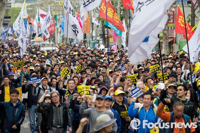 한편 ILO는 노동문제를 다루는 국제연합의 전문기구로 우리나라는 1991년 가입했다.(서울=포커스뉴스) 근로자의날을 맞은 1일 오후 서울 종로구 대학로에서 민주노총 주최로 열린 '2016 세계노동절대회'를 마친 참가자들이 종로로 행진을 이어가고 있다. 2016.05.01 양지웅 기자