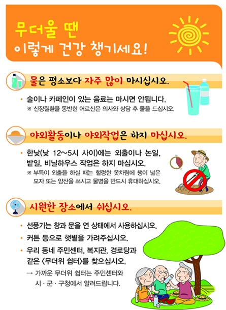 폭염으로 인한 건강피해를 막기 위해서는 △물 자주 마시기 △더운 시간대 휴식하기 등 건강수칙을 지키는 것이 좋다.