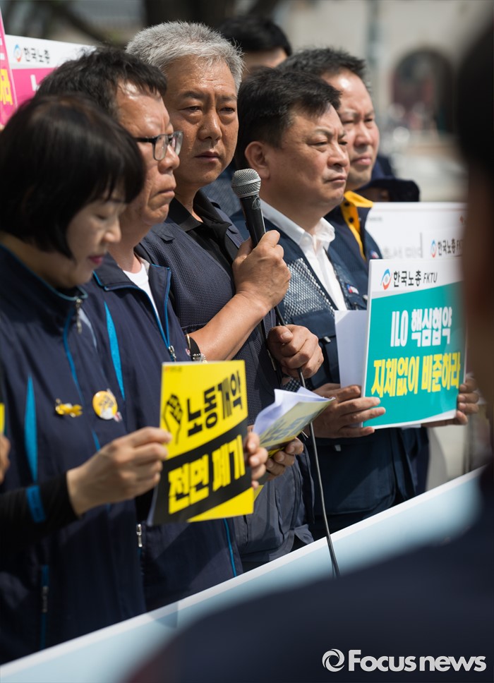 (서울=포커스뉴스) 23일 오전 서울 종로구 정부서울청사 앞에서 열린 한국정부의 불법지침과 사업장 시행 강행에 대한 ILO 제소 양대노총 기자회견에 참석한 김동만 한국노총 위원장이 모두발언을 하고 있다.