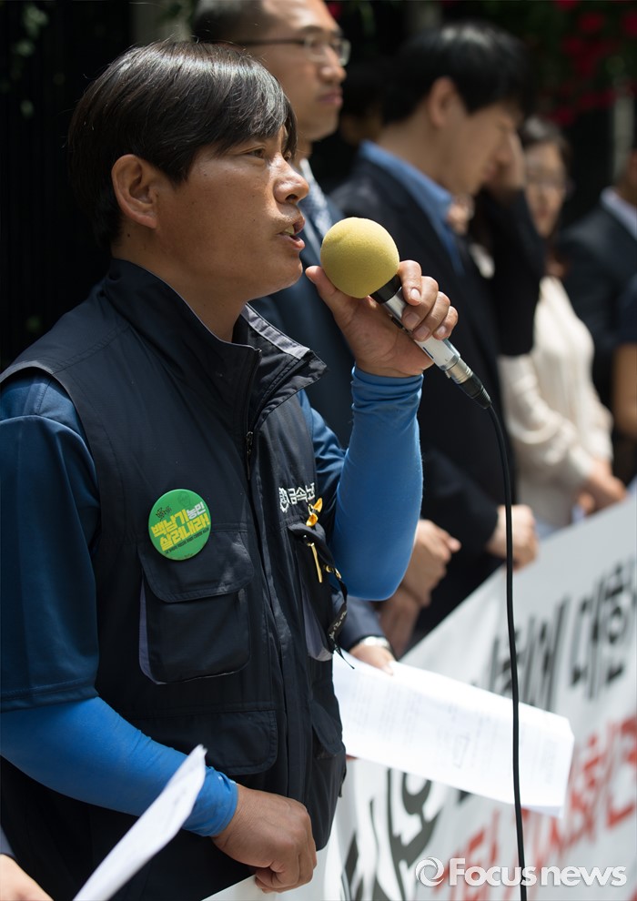 (서울=포커스뉴스) 엄기한(왼쪽) 전국금속노조 유성기업지회 대외협력부장이 23일 오전 서울 종로구 서울지방경찰청 앞에서 현대자동차 양재동 사옥 앞 집회에 대한 경찰의 위법한 공권력 행사 규탄 기자회견 중 모두발언 하고 있다.