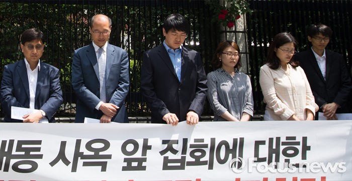 (서울=포커스뉴스) 민주사회를 위한 변호사모임 소속 변호사들이 23일 오전 서울 종로구 서울지방경찰청 앞에서 현대자동차 양재동 사옥 앞 집회에 대한 경찰의 위법한 공권력 행사 규탄 기자회견 전 故 한광호 열사에 대한 묵념을 하고 있다.