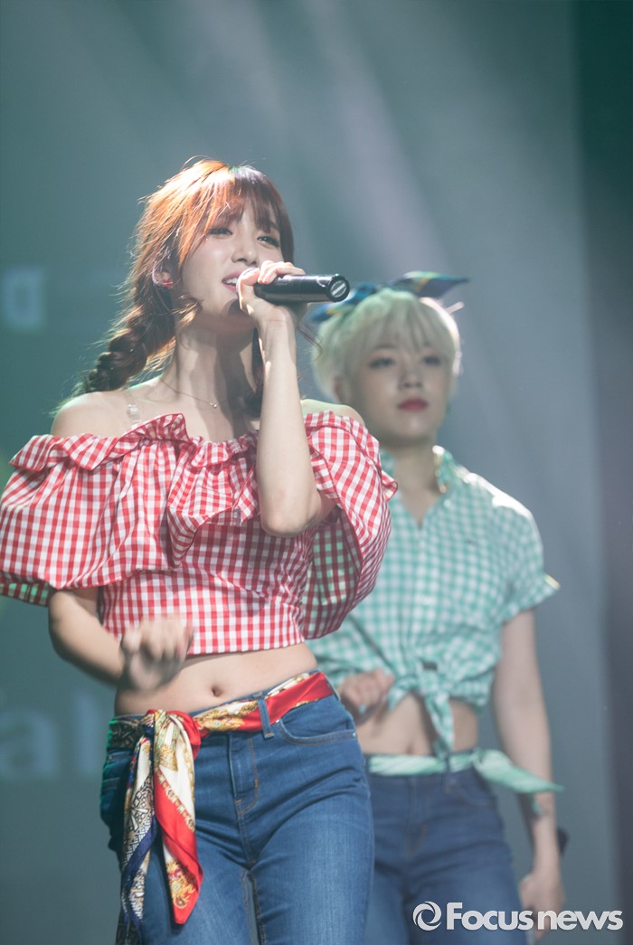 (서울=포커스뉴스) 23일 오전 서울 마포구 하나투어 브이홀에서 열린 걸그룹 타히티의 '알쏭달쏭' 쇼케이스에 참여한 멤버 지수(왼쪽)와 아리가 무대를 선보익 ㅗ있다.