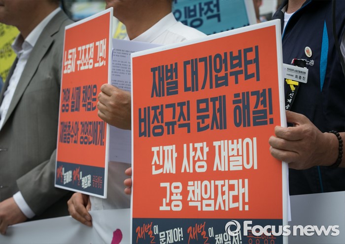 (서울=포커스뉴스) 23일 오전 서울 여의도 전국경제인연합회 앞에서 민주노총과 시민사회단체 등으로 구성된 재벌책임공동행동이 전경련 규탄 및 서울대행진 출발 기자회견을 하고 있다.
