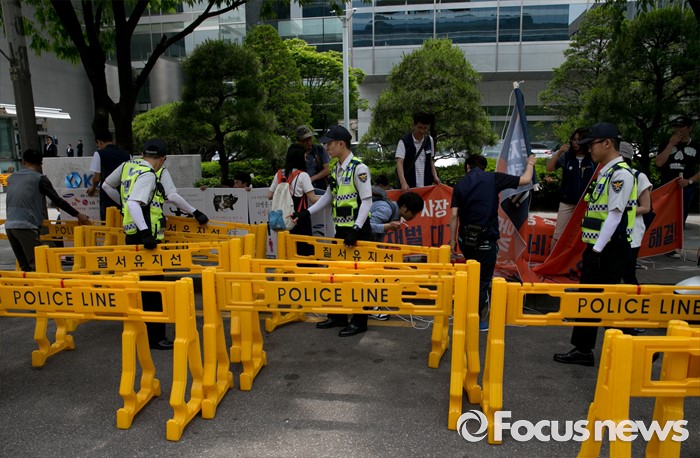 (서울=포커스뉴스) 23일 오후 서울 여의도 산업은행 본점 앞에서 민주노총과 시민사회단체 등으로 구성된 재벌책임공동행동이 규탄 및 서울대행진 출발 기자회견을 준비하고 있는 동안 경찰 병력이 시민들을 위한 질서유지선을 설치하고 있다.