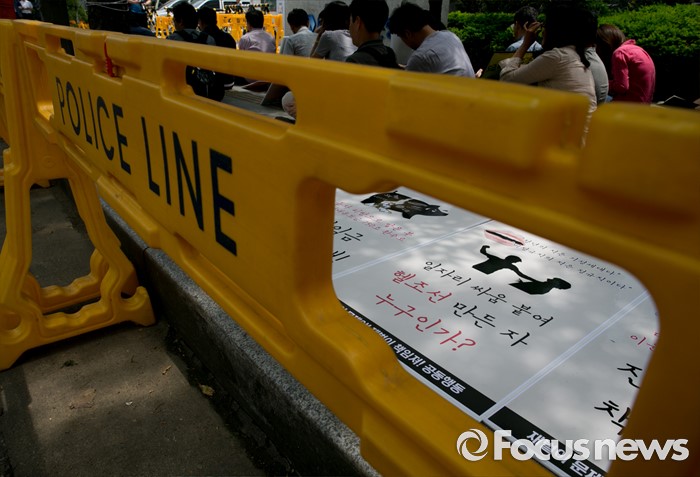 (서울=포커스뉴스) 23일 오후 서울 여의도 산업은행 본점 앞에서 민주노총과 시민사회단체 등으로 구성된 재벌책임공동행동이 규탄 및 서울대행진 출발 기자회견을 하고 있다.