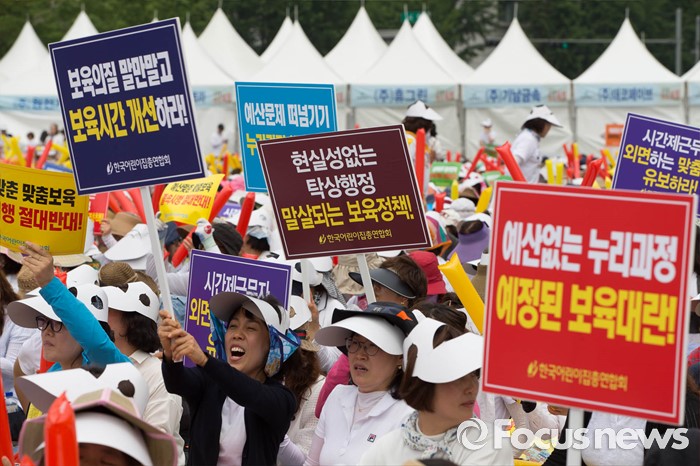(서울=포커스뉴스) 23일 오후 서울 중구 시청광장에서 보육관계자들이 '어린이집 0~2세 맞춤형보육 제도개선 및 시행 연기'를 촉구하며 결의대회를 하고 있다.